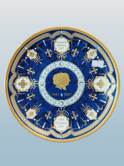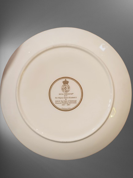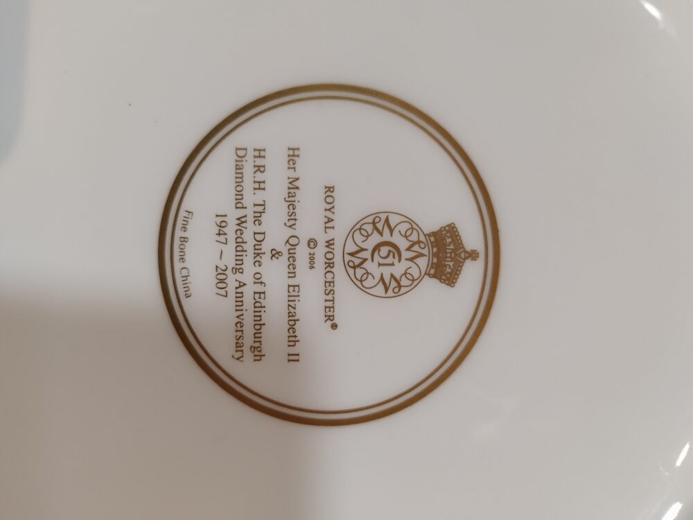 Assiette de collection datant de 2007. Elle commémore les noces de diamant de la Reine Elizabeth II et du Prince Philippe. Porcelaine réhaussée à la main. Les ronds blanc émaillées sont en relief. Diamètre 21 cm.