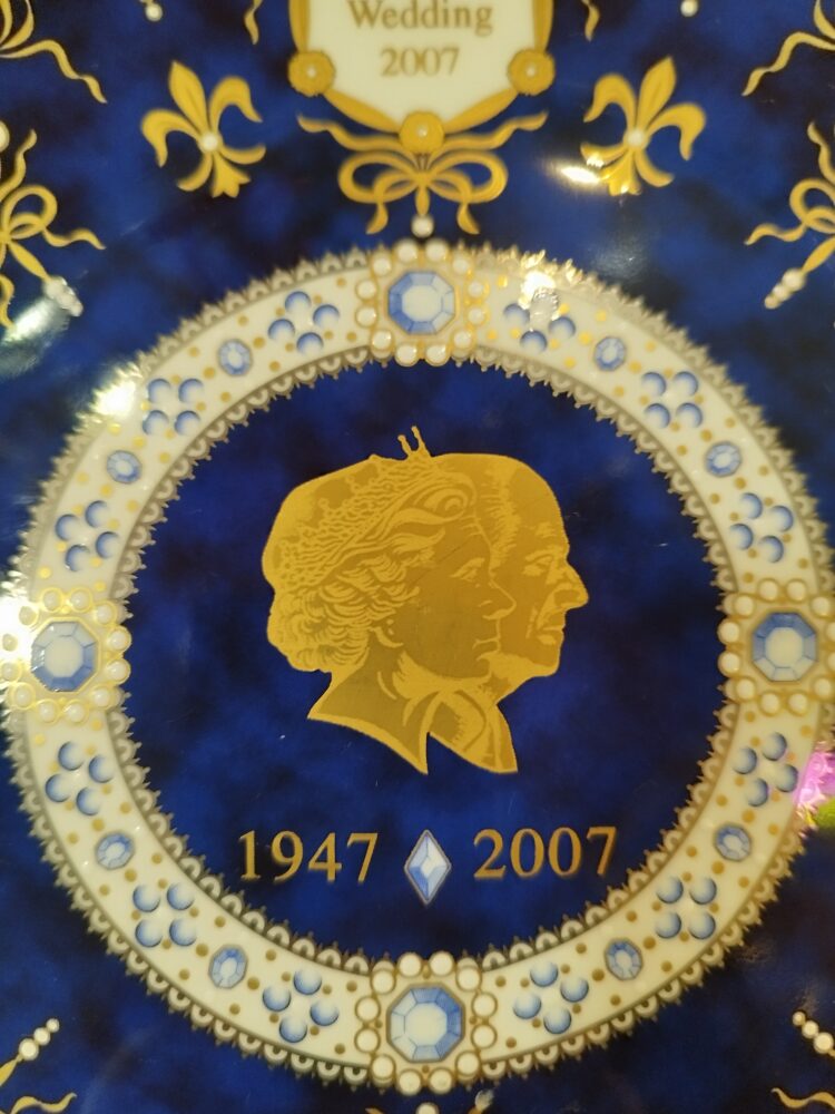 A collector’s plate dating from 2007. It commemorates the diamond wedding anniversary of Queen Elizabeth II and Prince Philip. Hand-painted porcelain. The white glazed circles are raised. Diameter 21 cm.