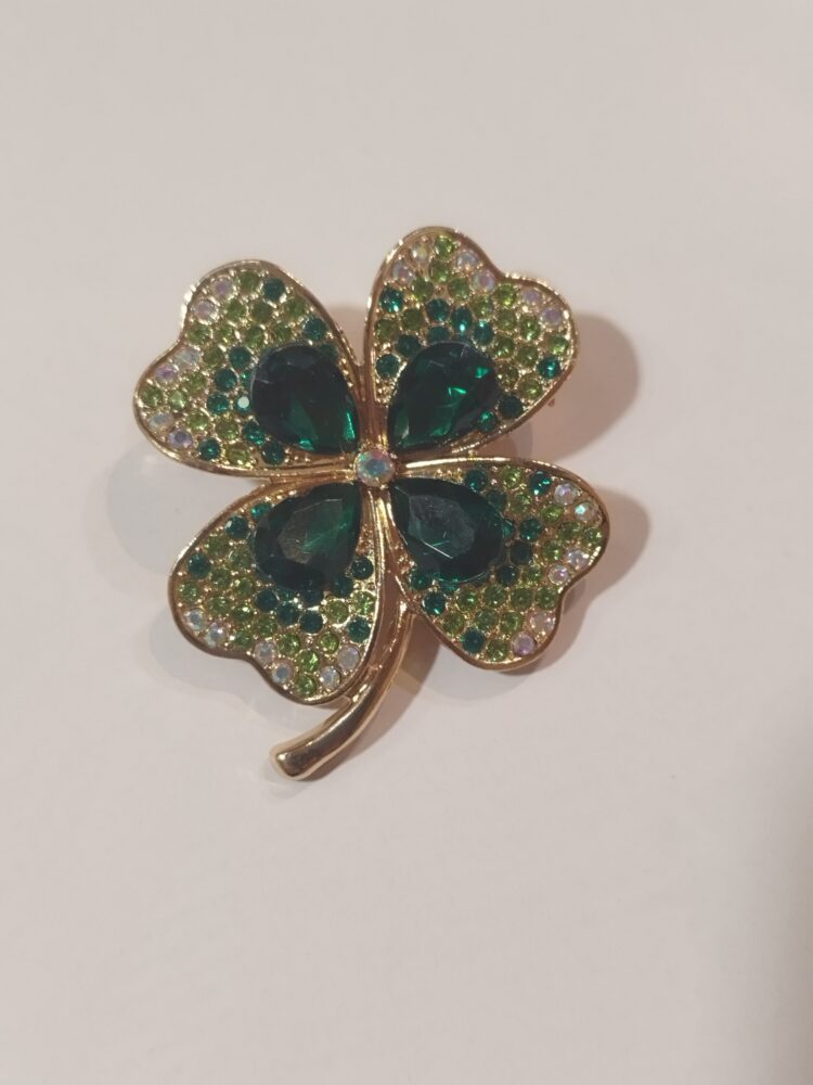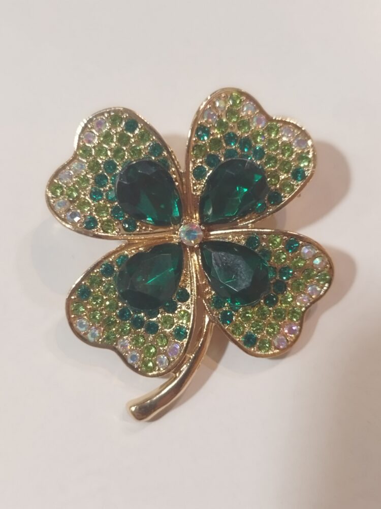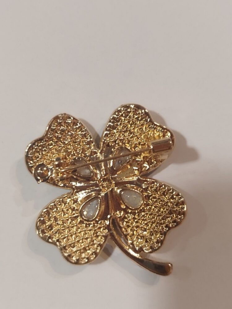 Broche représentant un trèfle à quatre feuilles symbol de porte bonheur. Métal et cristaux. Dimensions : 4 cm de hauteur et 3.3 cm de large.