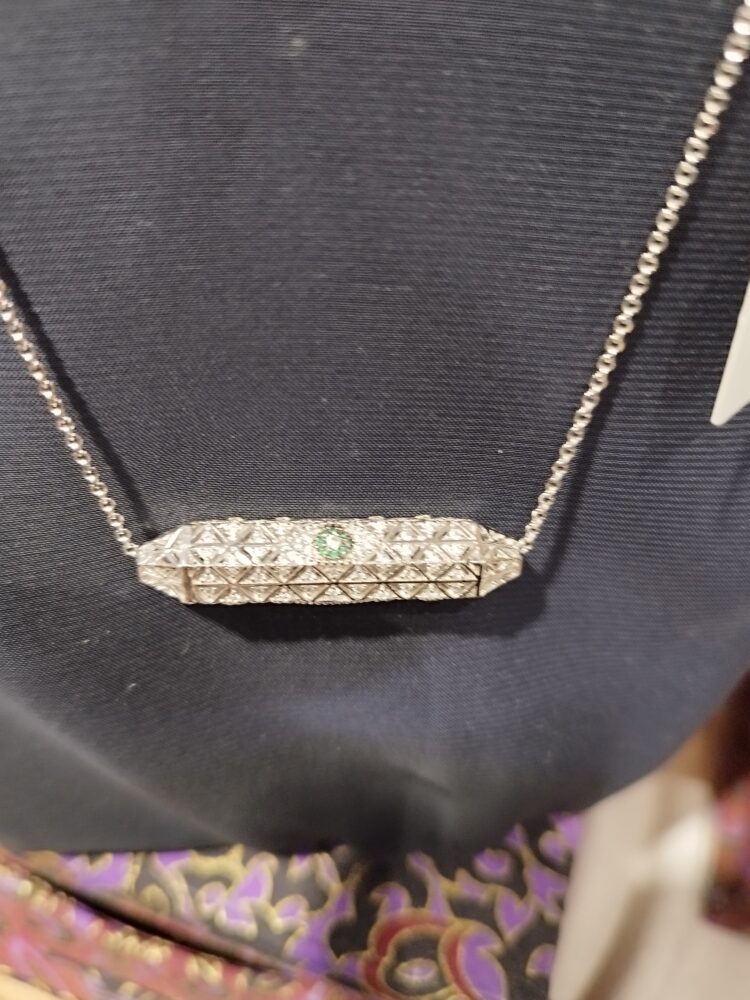 Collier APM Monaco qui n’est plus produit. Il a des fantaisies sur chaque face. Il est en argent et il est griffé APM Monaco. Et il est accompagné de sa boite d’origine. Les cristaux sont des oxydes de Zirconium. Réglable à la longueur voulue. La fantaisie mesure 3,8 cm de long et 0,9 cm de hauteur.