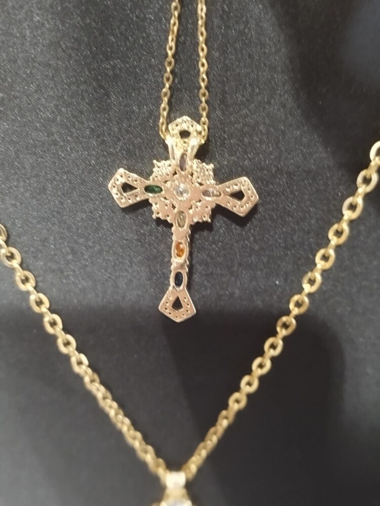 Collier avec Croix en cristaux multicolores Swarovski. Il est de fabrication artisanale française. Le métal de la croix est un mélange argent et platine dorée qui ne contient pas de nickel. Elle mesure 3.5 cm de hauteur et 2,4 cm de largeur.