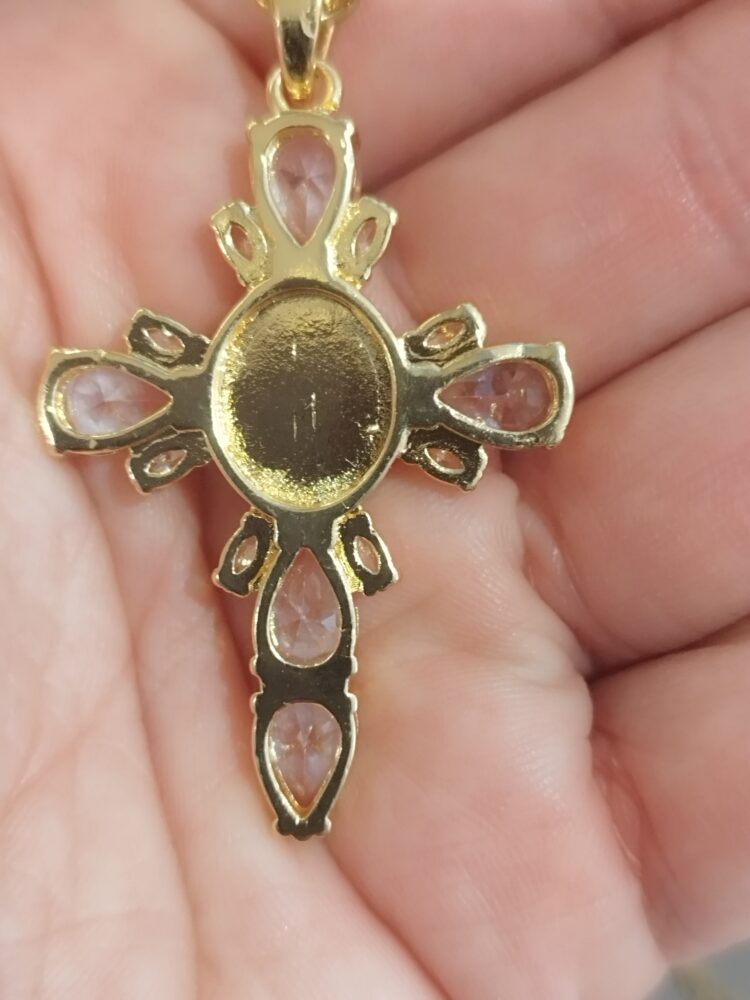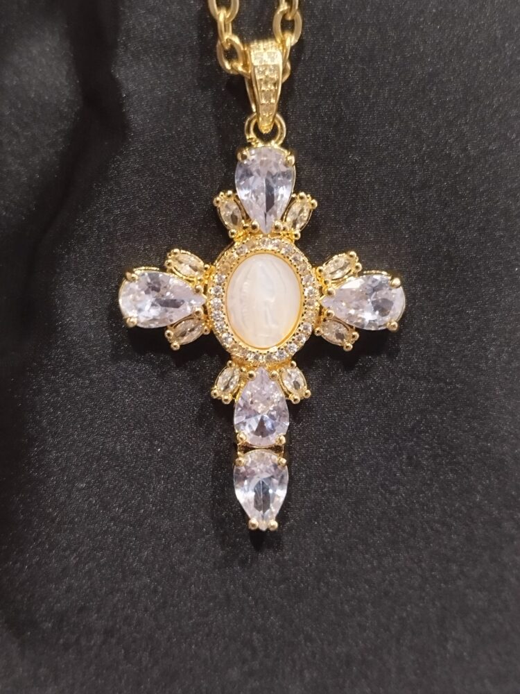 Necklace with Golden Cross and Swarovski crystals. It is handcrafted in France. The metal of the cross is a mixture of silver and platinum gold which does not contain nickel. It measures 4.5 cm in height and 3 cm in width. In the middle is a medallion of the Virgin which is white..