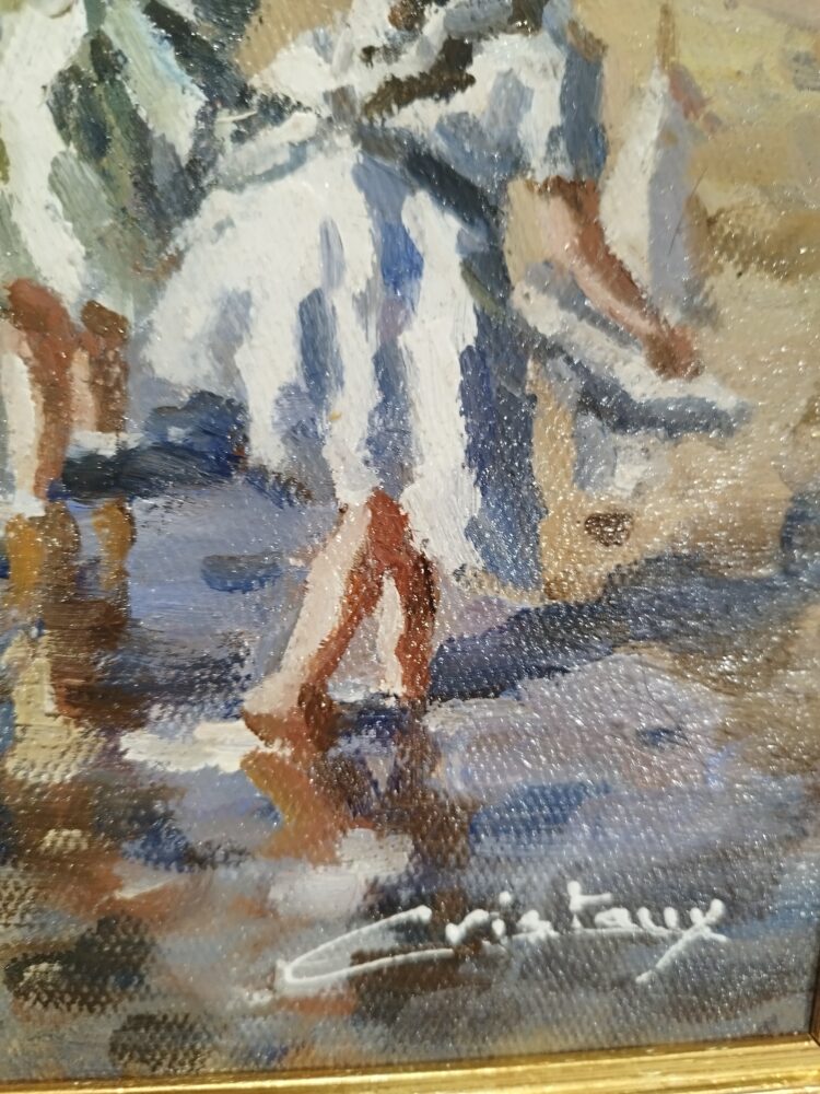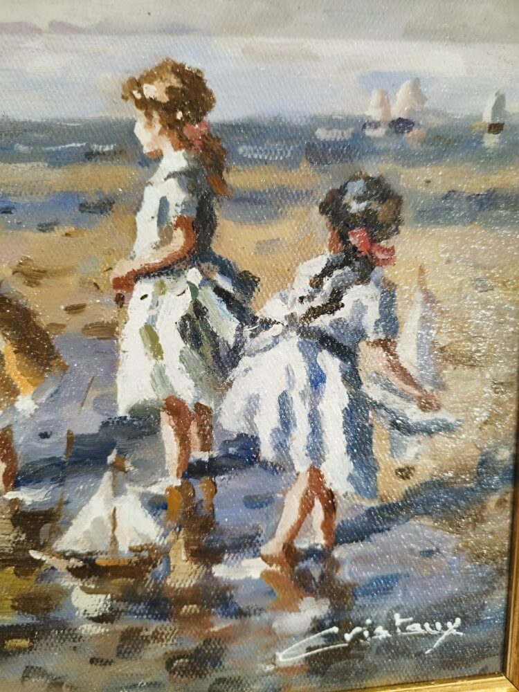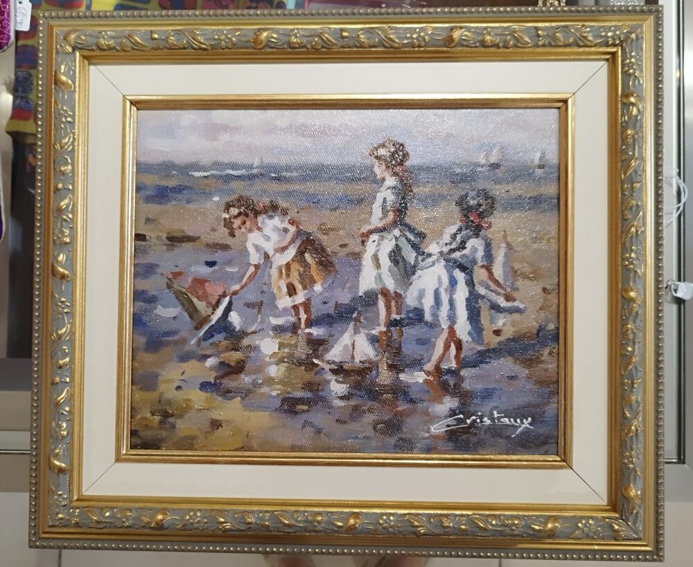 This original painting by Francis Cristaux captures a timeless childhood moment. Three children take their boat sailing in the waves.