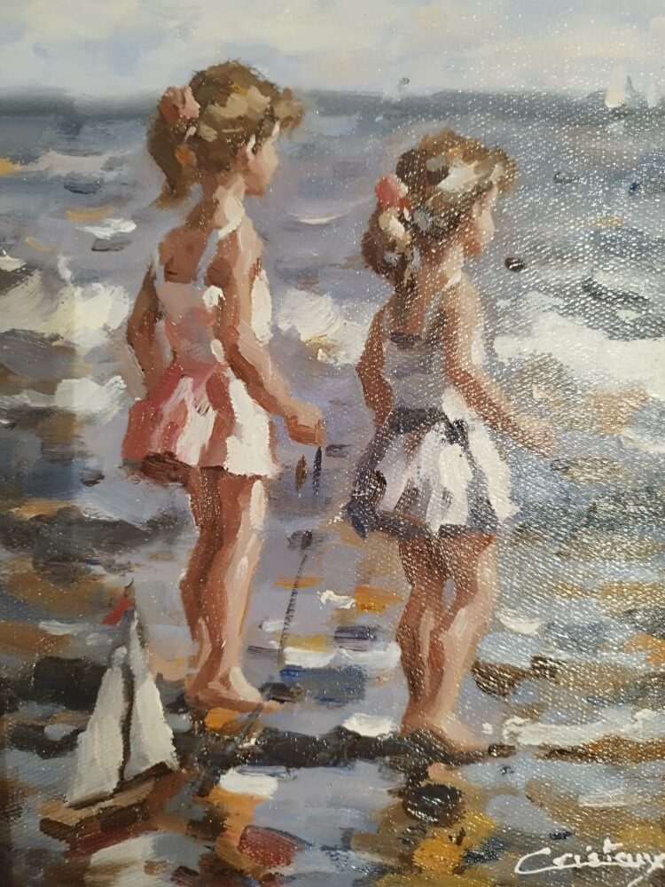 This original painting by Francis Cristaux captures a timeless childhood moment. Two little girls take their boat sailing in the waves.